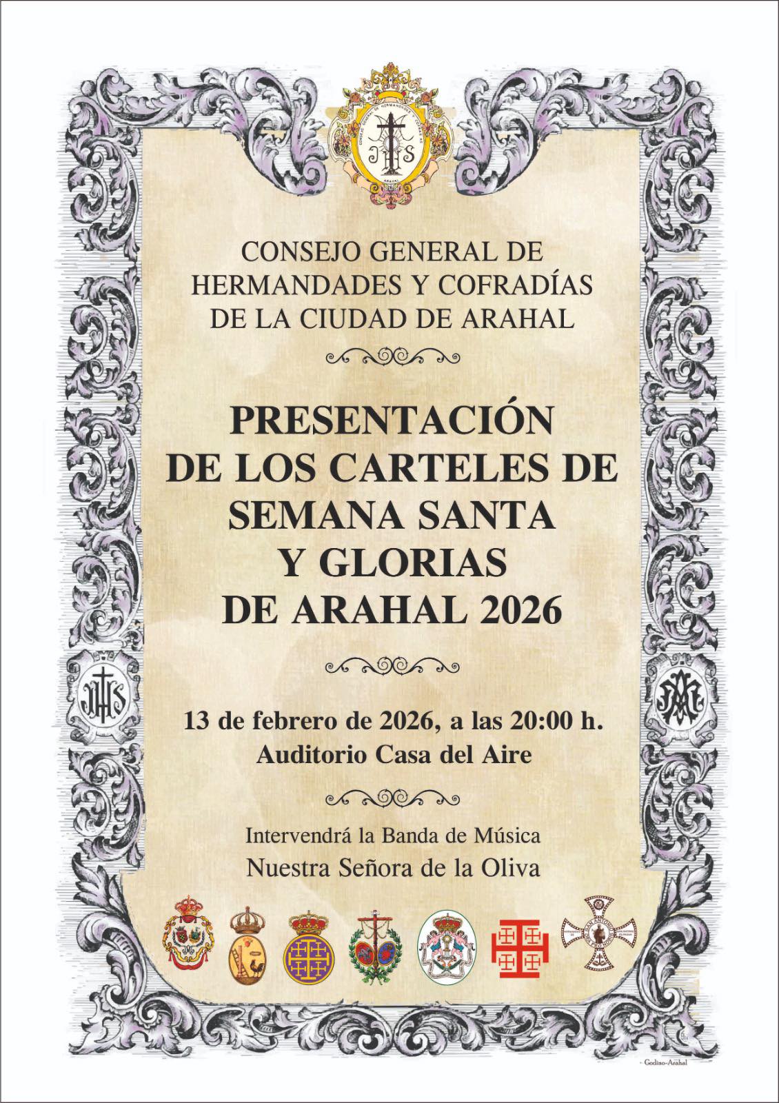 El próximo viernes 13 de febrero de 2026 a las 20:00 horas en el auditorio de la casa del aire presentamos los carteles de Semana Santa obra de D. José Antonio Galán Gutiérrez, y el cartel de las Glorias obra de D. Fernando Gallardo Humanes.