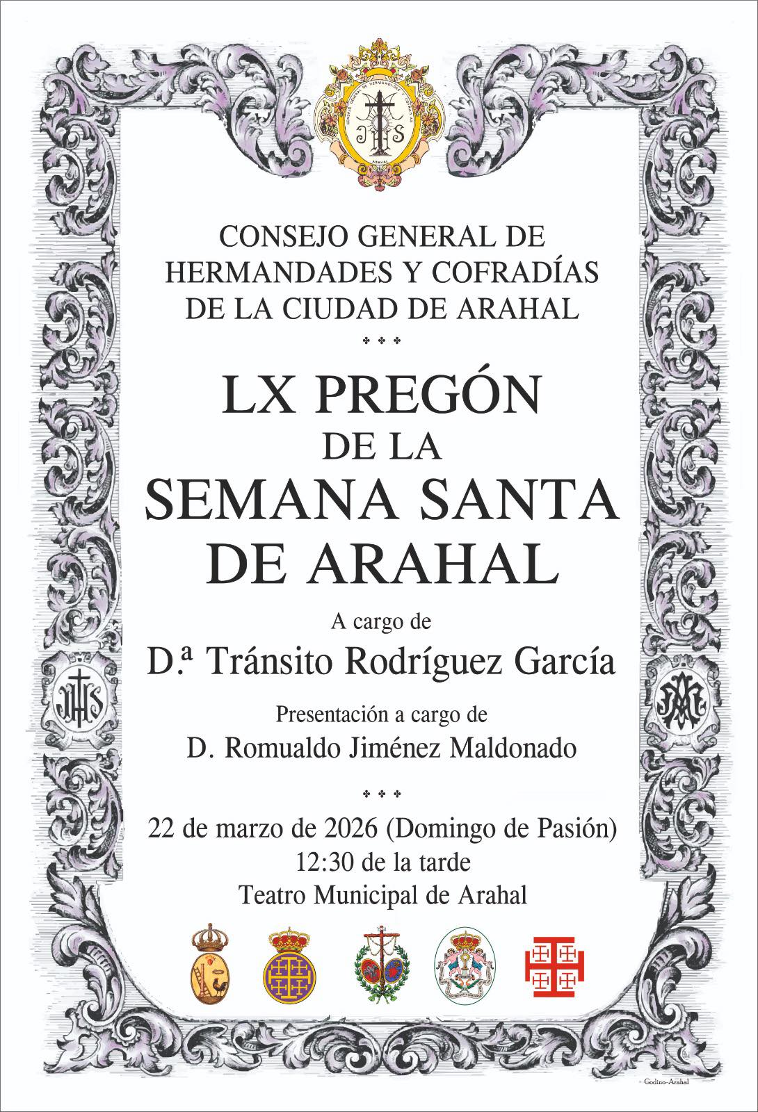 LX Pregón de la Semana Santa de Arahal a cargo de Dña. Tránsito Rodríguez García que será presentada por D. Romualdo Jiménez Maldonado. El próximo domingo 22 de marzo a las 12:30 horas en el teatro municipal. Entrada libre hasta completar aforo. Intervendrá la Banda de Música Municipal de Arahal.