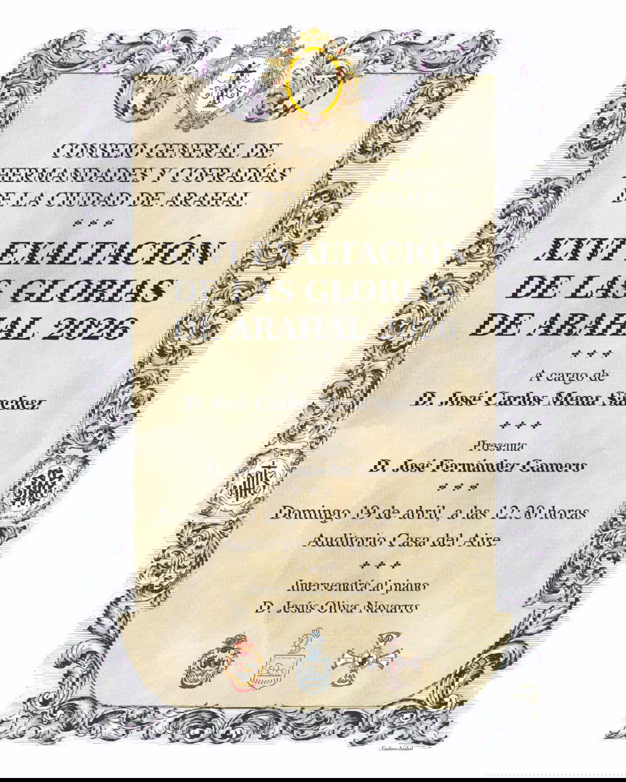 El próximo domingo 19 de abril a las 12:30 horas en el auditorio de la Casa del Aire celebramos la XXVI Exaltación de las Glorias a cargo de D. José Carlos Mena Sánchez y presentado por D. José Fernández Gamero. El acto será amenizado por D. Jesús Oliva Navarro al piano.